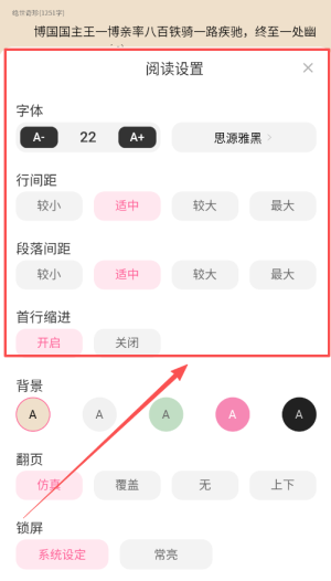 4、阅读设置选项允许用户自由调整界面背景和字体样式,打造最符合个人喜好的阅读环境,让您畅享无阻阅读乐趣。