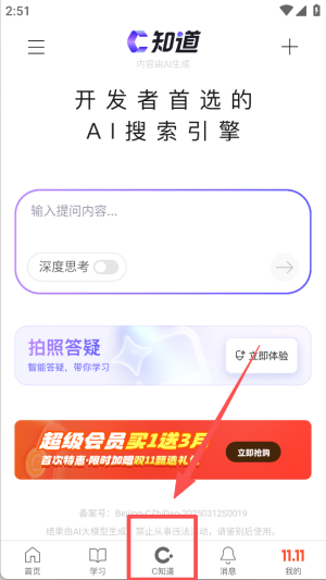 3、点击底部 “C 知道”,进入开发者首选的 AI 搜索引擎页面,可输入问题提问,也能体验拍照答疑功能。
