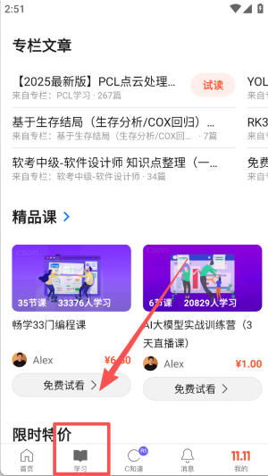 2、点击底部 “学习” 板块,能查看专栏文章和精品课,如 PCL 点云处理、软考中级知识点整理等内容,部分课程可免费试看。