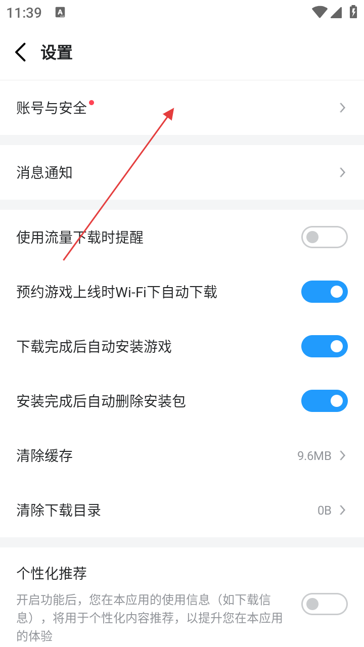 3、在设置页面,若要进行账号安全相关操作,点击【账号与安全】,进入账号与安全页面。