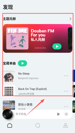 2、打开应用后,首页会自动播放一首歌曲,用户可通过简单的操作来表达对当前歌曲的喜好,使系统学习用户的偏好。