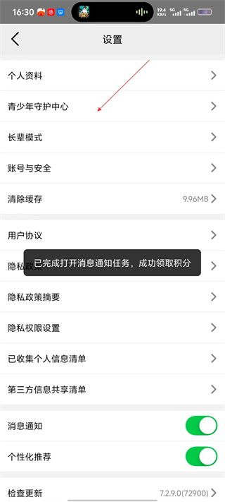 3、在【设置】页面,找到【青少年守护中心】选项并点击,可进入青少年模式相关设置界面。
