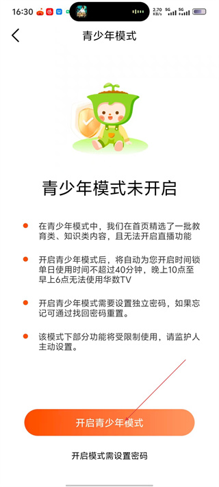 4、进入【青少年模式】页面,若需开启该模式,点击【开启青少年模式】按钮,后续按提示设置独立密码即可。