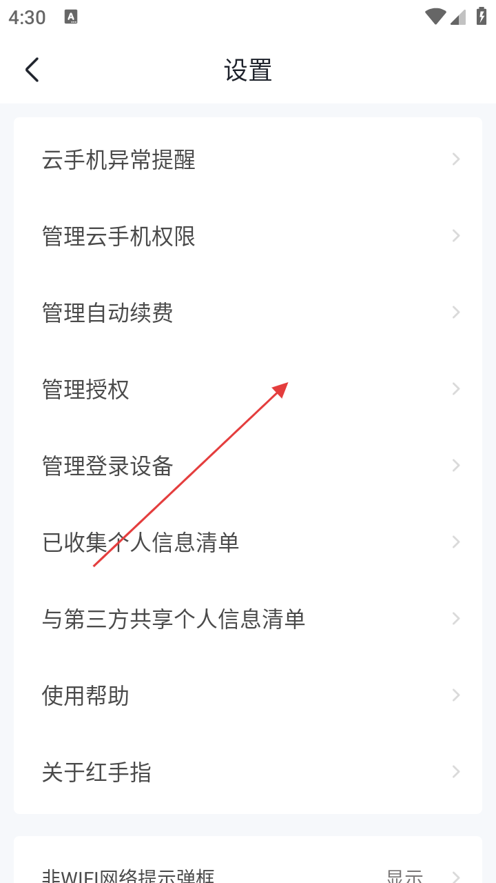 3、在设置页面,点击【管理授权】选项,可进入手机号登录注册页面。