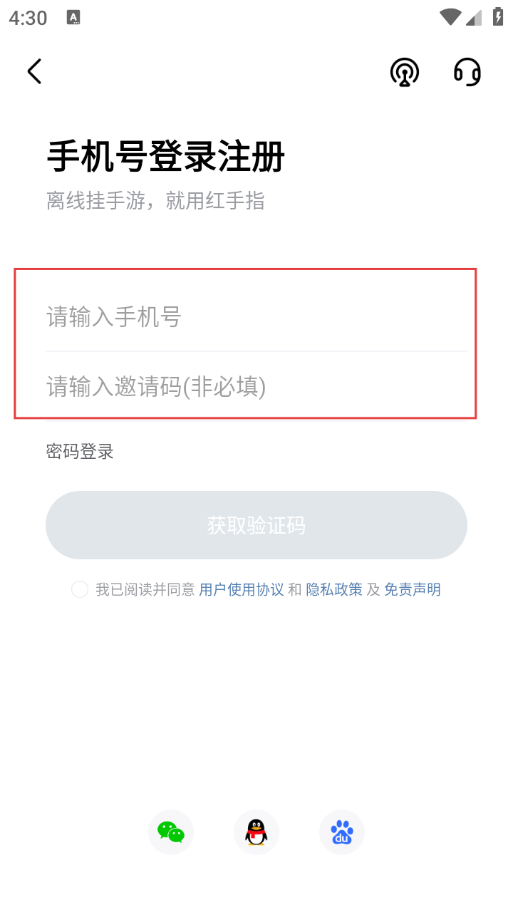 4、在手机号登录注册页面,输入手机号和邀请码,点击【获取验证码】完成登录注册,即可管理自动续费功能。