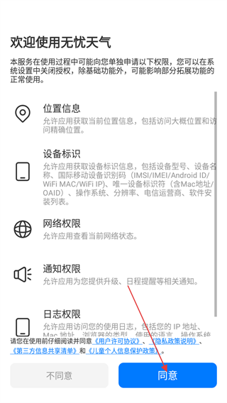 1、首次打开“无忧天气”,阅读权限说明及相关协议后,点击“同意”按钮,完成授权并进入应用。