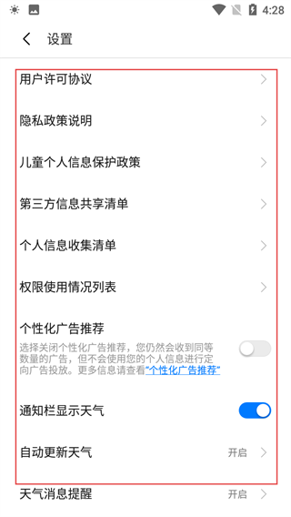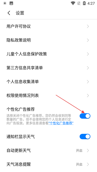 3、在设置页,找到“个性化广告推荐”选项,点击其右侧的开关按钮,关闭个性化广告推荐功能。