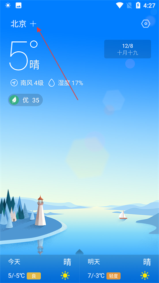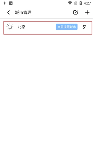 1、在天气主界面,点击左上角“北京”旁的“+”按钮,进入城市管理页面。