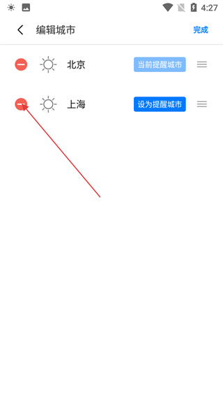 3、在编辑城市页,点击目标城市(如上海)左侧的“-”按钮,发起城市移除操作。