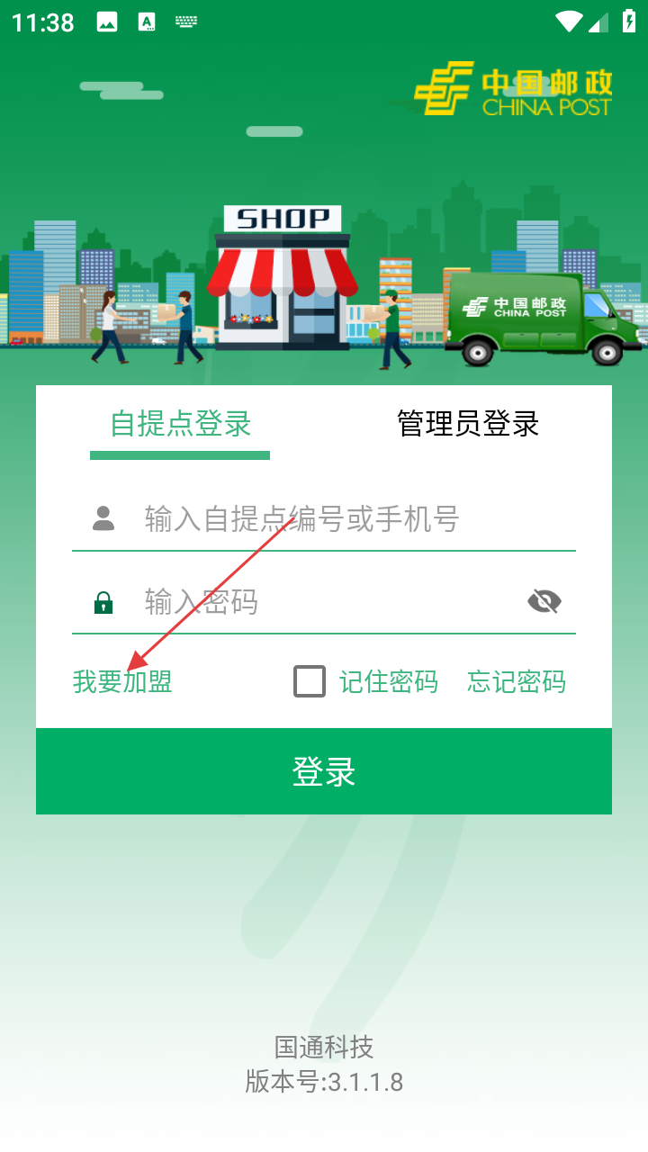 1、打开中邮e通,在登录页面,若要申请加盟,点击【我要加盟】选项,进入新商户加盟申请界面。