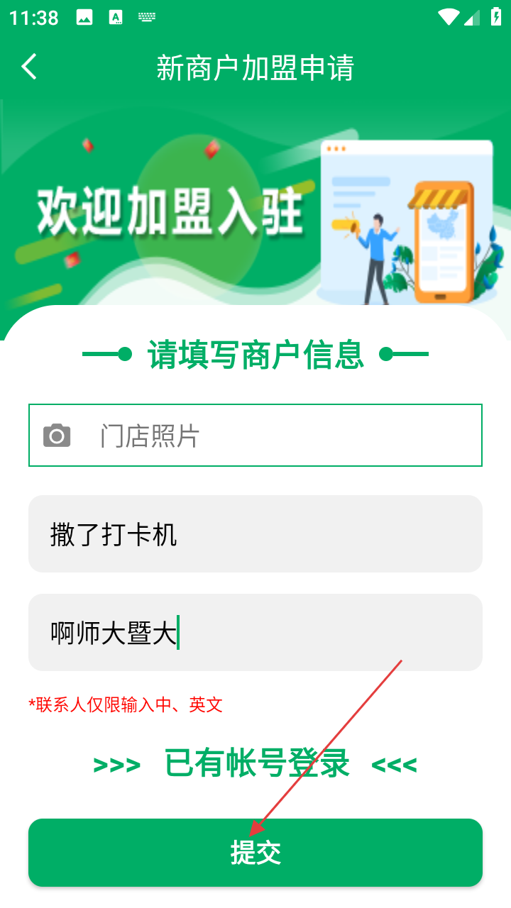 3、填写好商户名称、联系人姓名等信息,确认无误后,点击界面底部的【提交】按钮,提交加盟申请。