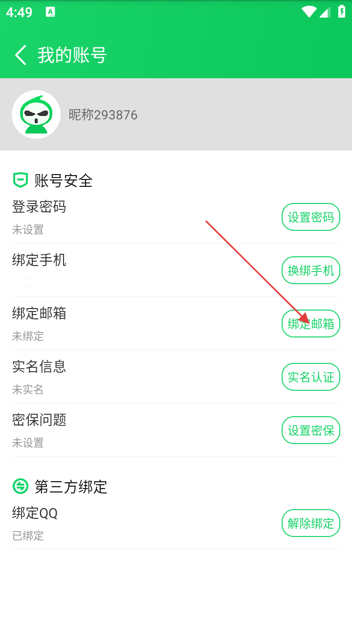 3、在账号安全设置页面,点击【绑定邮箱】选项,可进入邮箱绑定流程。