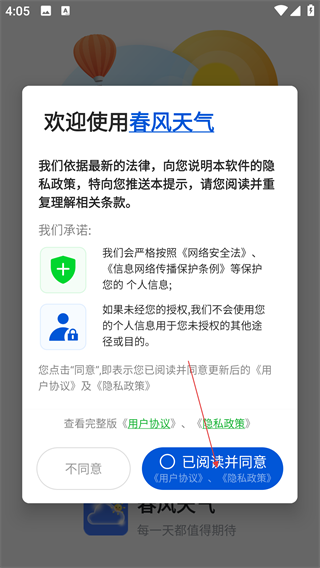 1、首次打开“春风天气”,勾选“已阅读并同意”选项,完成《用户协议》《隐私政策》确认,进入应用主界面。
