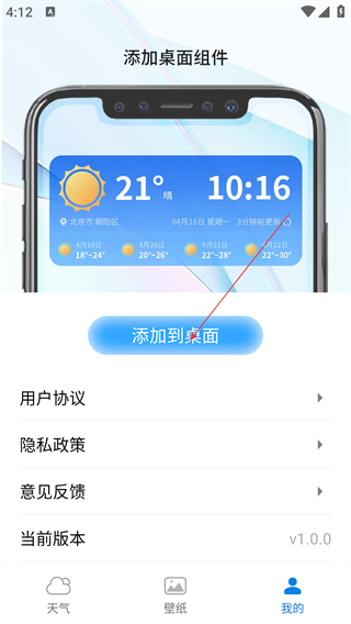 3、在个人中心页,点击“添加到桌面”按钮,触发桌面组件添加流程。