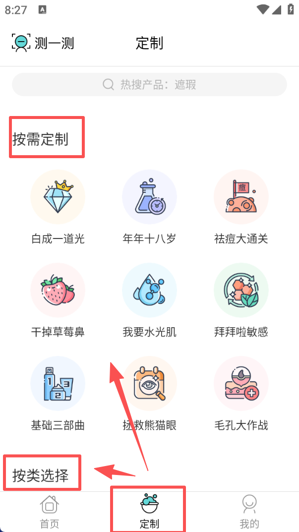 3、切换到定制页面,在按需定制板块选择美白、祛痘等护肤方向,获取专属护理方案。