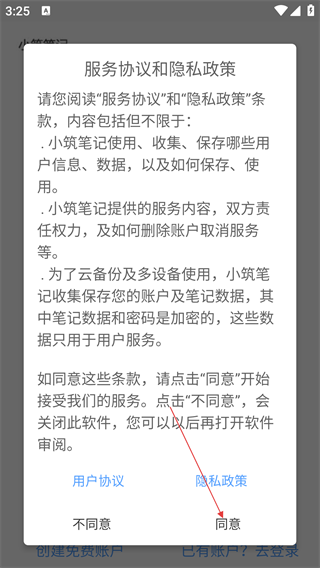 1、打开【小筑笔记】,阅读“服务协议和隐私政策”后,点击【同意】进入应用。