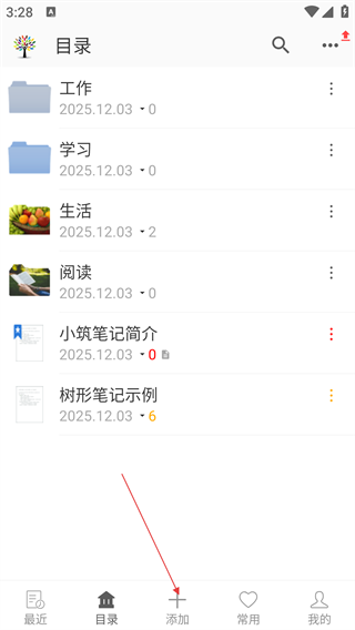 1、在【小筑笔记】目录页,点击底部【添加】按钮,展开功能菜单。