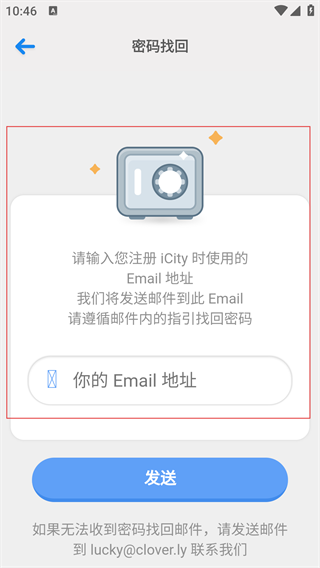 4、密码找回时,输入注册iCity时使用的Email地址,点击【发送】,遵循邮件指引即可找回密码。