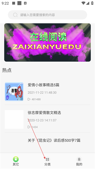 1、打开软件后,点击底部【分类】,可进入分类界面,浏览各类阅读内容。
