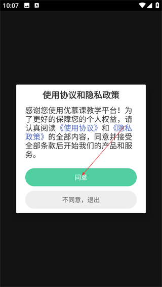 1、在优慕课教学平台的使用协议弹窗中,点击【同意】按钮,接受《使用协议》和《隐私政策》,进入后续流程。