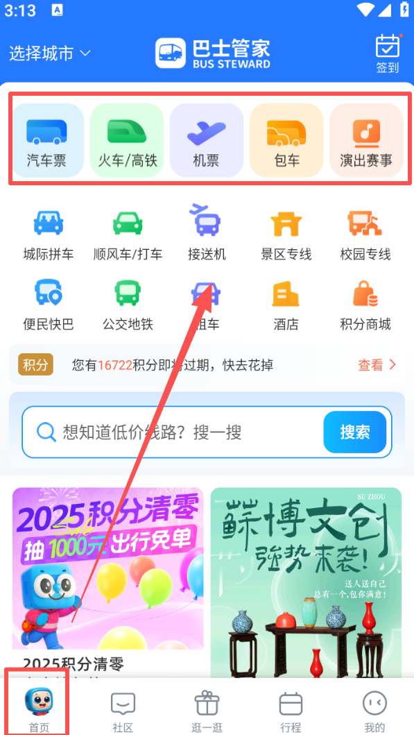 1、打开巴士管家 APP,在首页点击 “火车 / 高铁” 选项,进入票务查询界面。