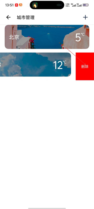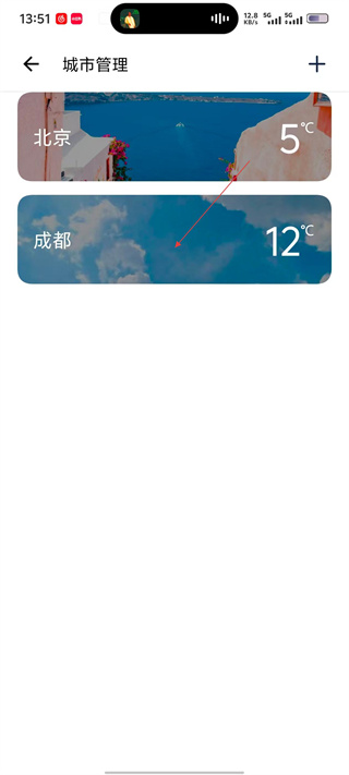 2、在城市管理页,长按目标城市(如成都)的天气卡片,唤起操作选项。