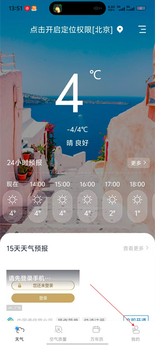 1、在天气主界面,点击底部“我的”选项,进入个人中心页面。