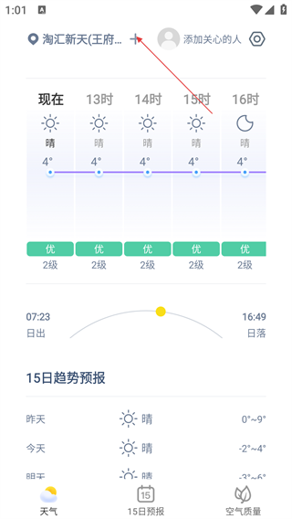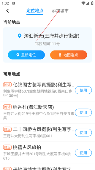 2、在定位地点页,可选择当前定位地点,或切换附近地点查看对应天气。