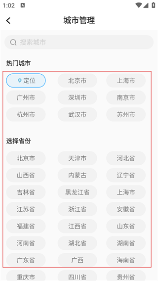 4、在城市管理页,从热门城市或按省份选择目标城市,添加后即可查看其天气信息。