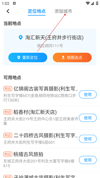 2、在定位地点页,可选择当前定位地点,或切换附近地点查看对应天气;点击“添加城市”标签,进入城市管理界面。