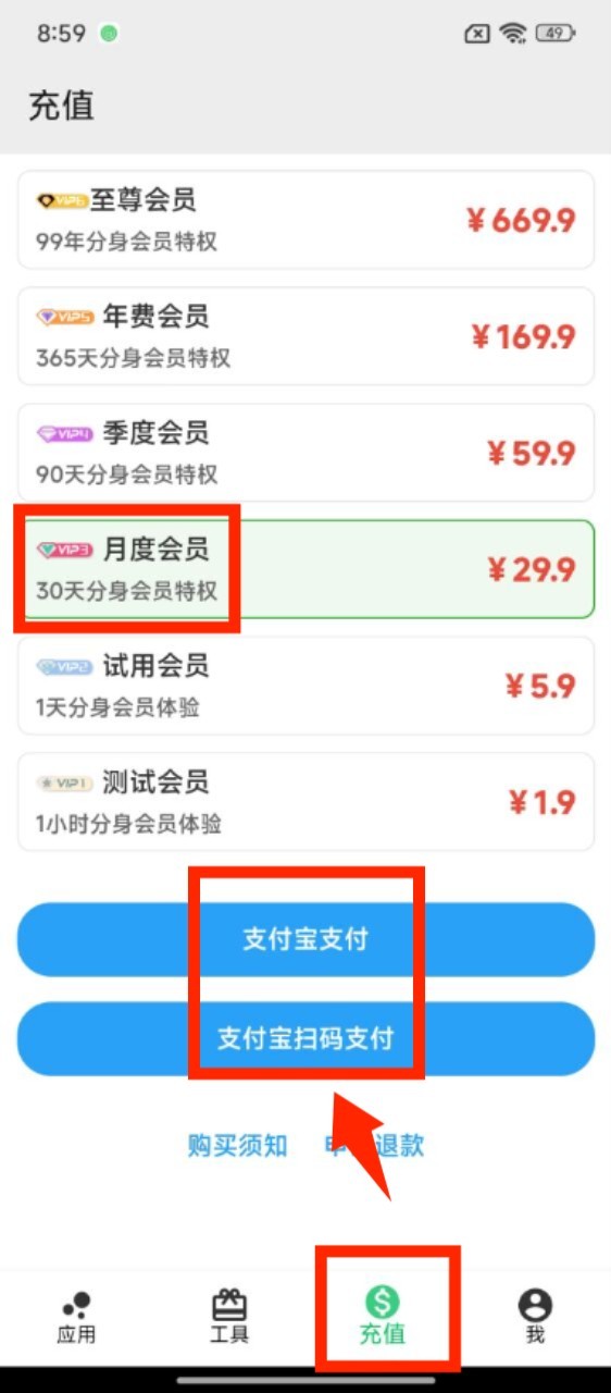 3、打开充值页面,选择月度会员等套餐,通过支付宝支付或扫码支付的方式完成会员开通。