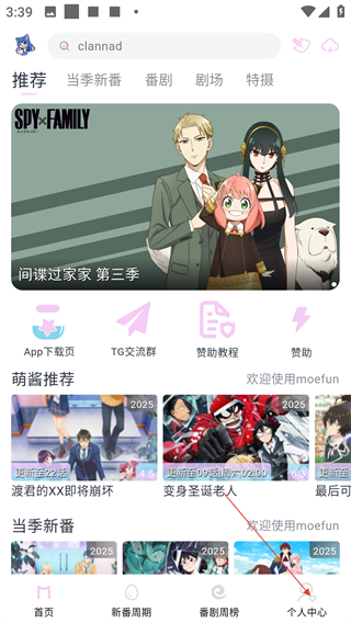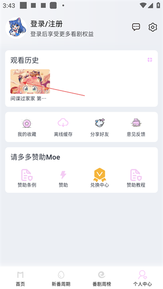 1、进入软件主页,可浏览【推荐】【当季新番】等分类的番剧,点击底部【个人中心】选项,切换至个人中心页面。