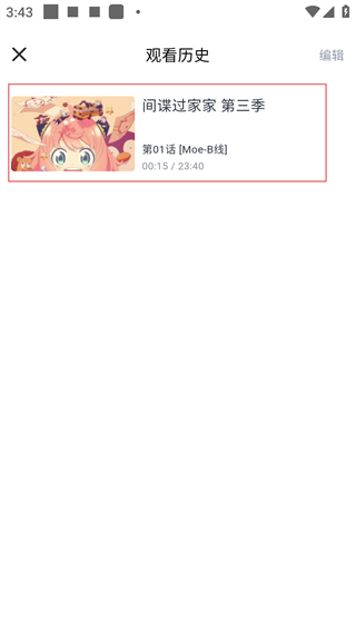 3、在观看历史页面,点击对应番剧条目,可跳转至该番剧的播放界面,继续观看已暂停的内容。