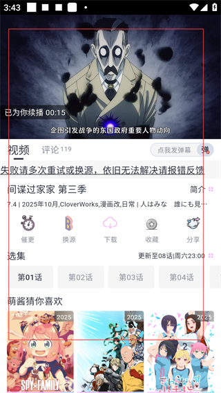 4、进入番剧播放界面后,系统会自动续播至上次观看进度,同时可使用【换源】【下载】【收藏】等功能,还能查看番剧简介与选集。