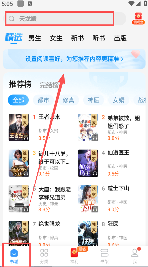 1、打开软件,在书城页面顶部搜索框输入书籍名称,可查找想要的书籍。