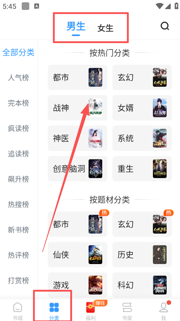 2、点击底部 “分类”,在分类页面选择 “男生” 或 “女生” 板块,按热门或题材分类浏览书籍。