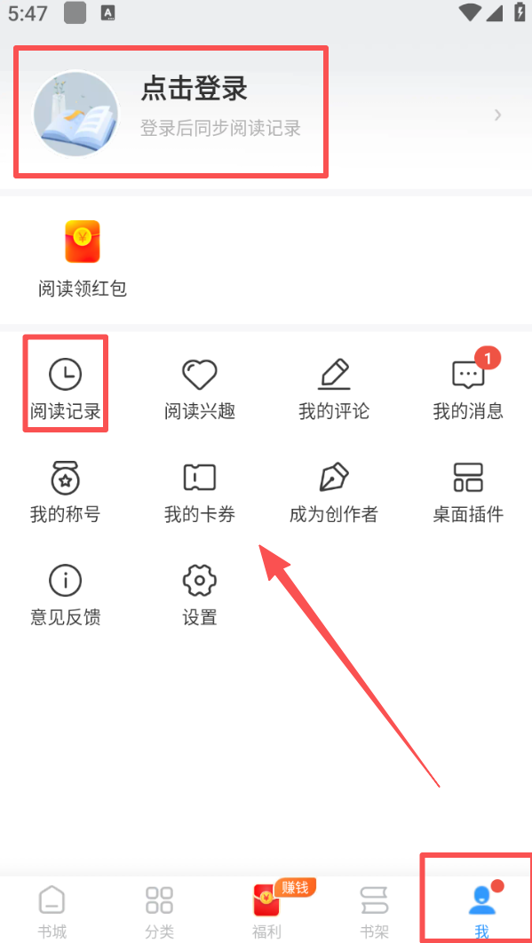 4、点击底部 “我”,在个人页面点击 “阅读记录”,可查看过往的书籍阅读情况,点击登录还能同步阅读记录。