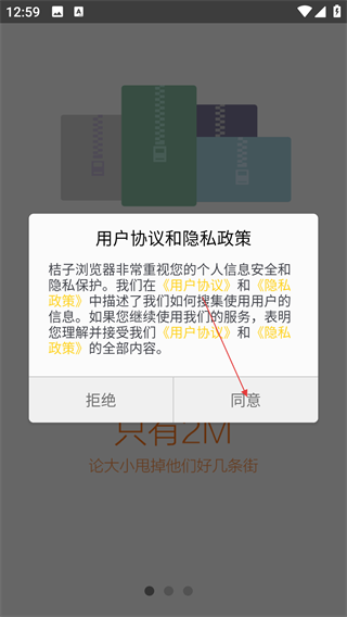 1、在桔子浏览器用户协议和隐私政策弹窗中,点击【同意】,接受《用户协议》和《隐私政策》,即可进入浏览器主界面。