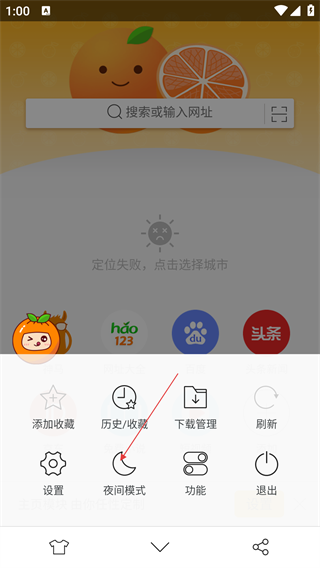 3、在功能菜单中,点击【夜间模式】,可进入亮度调节界面,调整浏览器显示亮度。