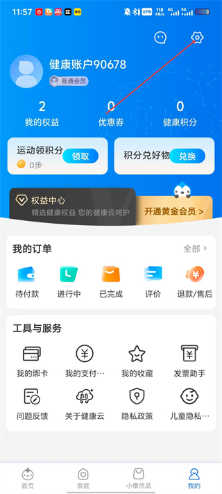 1、进入健康云应用首页,点击底部导航栏的“我的”选项,进入个人中心页面。