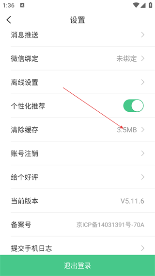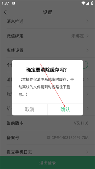 3、在设置页面点击【清除缓存】,弹出确认清除缓存的提示框。