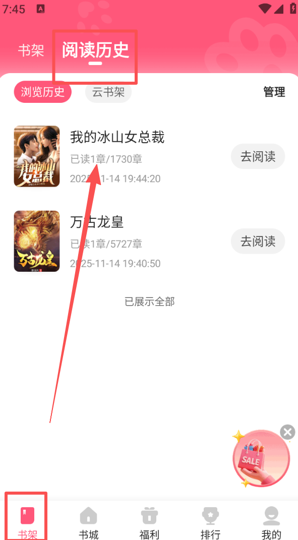4、切换到 “书架” 页面的 “阅读历史” 板块,可查看之前阅读过的小说记录。