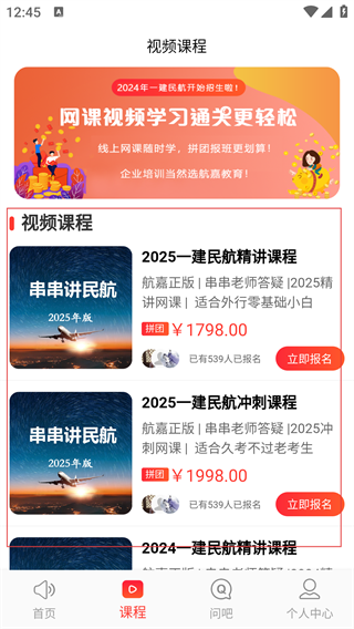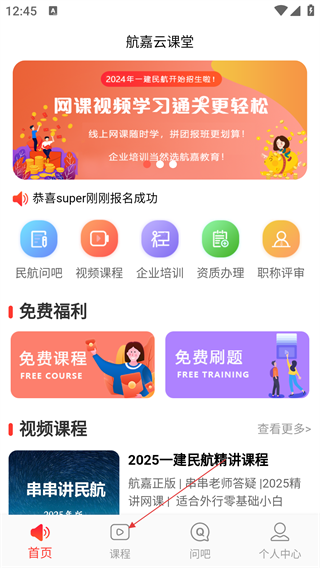 1、进入“航嘉云课堂”首页,可浏览课程、免费福利等内容,功能涵盖民航问吧、视频课程、企业培训等。