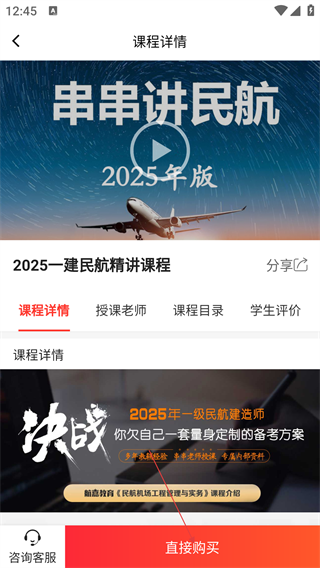 3、进入课程详情页,可查看课程介绍、授课老师等信息,点击【直接购买】触发登录流程。