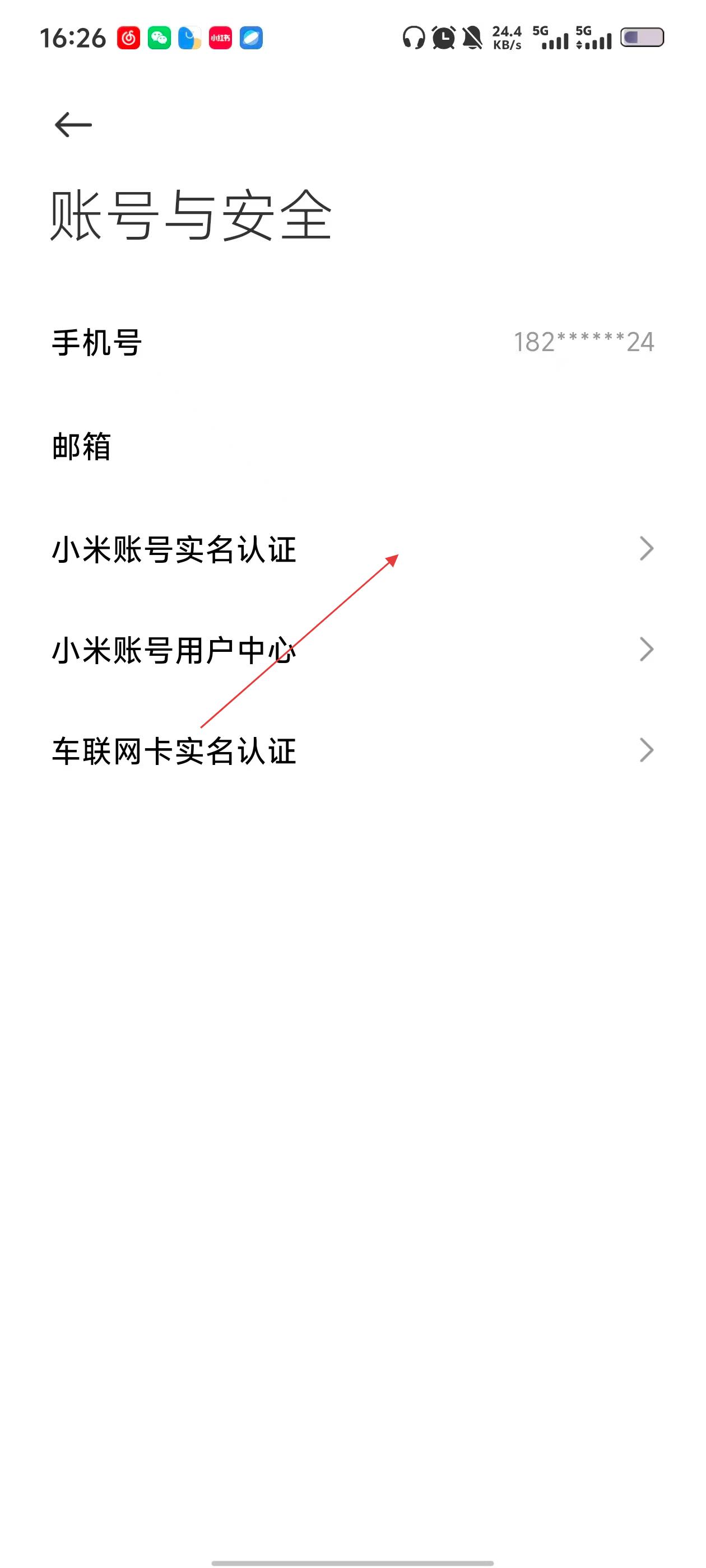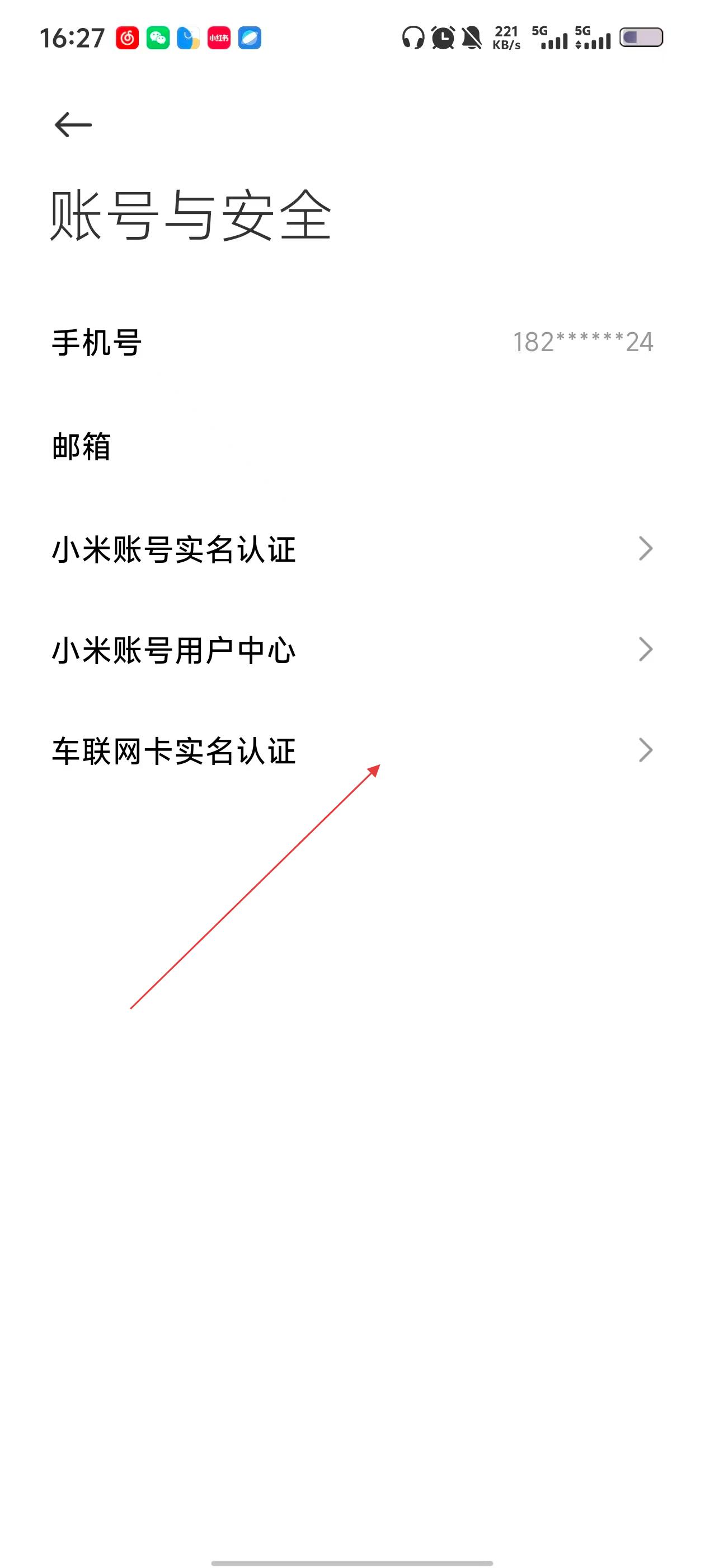 3、在设置界面中,点击【账号与安全】选项,可进入账号安全管理界面,找到【车联网卡实名认证】入口。