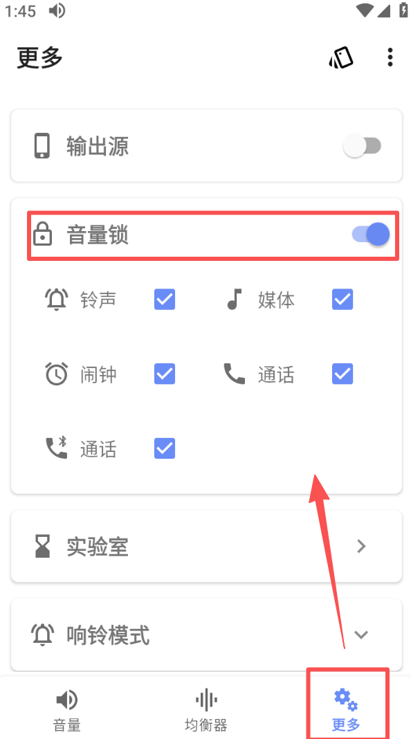 4、进入更多页面,启用音量锁功能,勾选铃声、媒体等选项,锁定对应场景的音量设置。