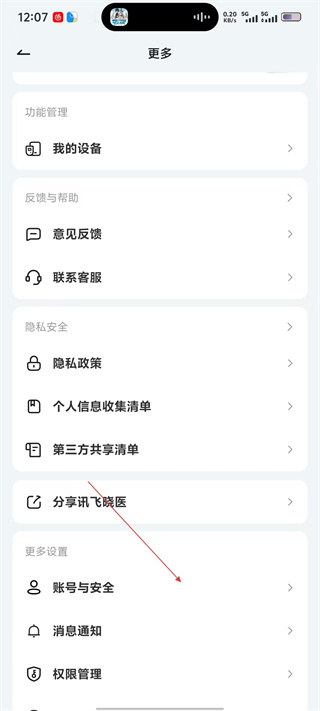 2、进入【更多】设置页,可通过“账号与安全”管理账号相关配置,也能使用设备管理、意见反馈等功能。