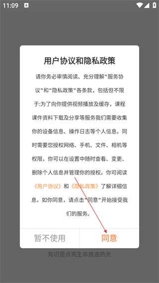1、首次进入看点云课堂App,点击【同意】《用户协议和隐私政策》,完成服务授权。