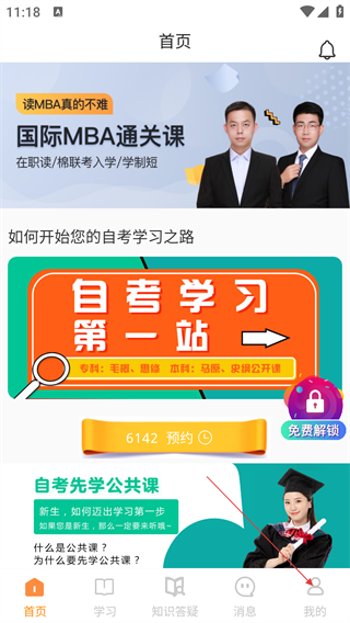 2、进入App首页,可浏览课程(如国际MBA通关课、自考公共课)等内容。