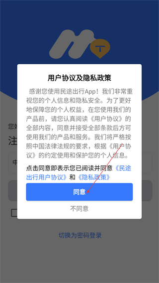 1、首次登录时,点击【同意】按钮,确认《用户协议及隐私政策》,完成服务授权。